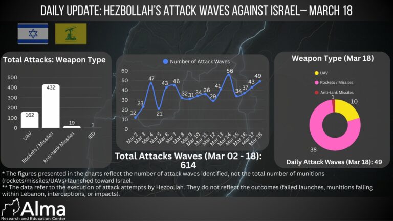 On March 18, 49 attack waves by Hezbollah against Israel were identified. In terms of weapon types, 38 attack