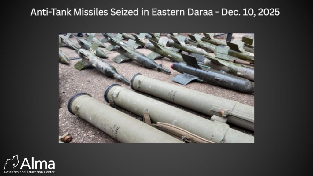 On December 10, Syrian security forces raided a weapons warehouse that had been established at a farm in the eastern Daraa Governorate. The warehouse contained 42 “Sagger” anti-tank missiles and four “Metis” anti-tank missiles, along with their launchers. Over the past year, we have witnessed similar weapons seizures by Syrian security forces in southern #Syria, but not on a scale or in quantities that correspond to the scope and amount of weapons actually present in this area. The weapons seized over the past year in southern Syria by Syrian security forces point to the potential for a significant threat. Such weapons are, among other things, intended for potential use by local terrorist cells operated by the Shiite axis, #ISIS, or Palestinian organizations against #IDF forces operating in southern Syria, a scenario that could lead to a broad security escalation. In addition, there is a real potential for their smuggling through Jordan into the Judea and Samaria area, thereby altering the security threat environment in Judea and Samaria.