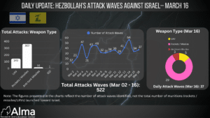 On March 16, 37 Hezbollah attack waves against Israel were identified. In terms of weapon types, 29 attack waves (approx. 78.4%) were carried out using