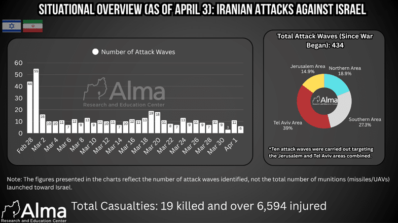 During the holiday evening (April 1), a relative increase in the scope of attacks was recorded, with most attack waves directed at the Tel Aviv area and including missiles with dispersal warheads. This reflects an attempt to intensify harm to the civilian rear and increase the potential for damage. However, the increase in the number of attacks remained within the daily average range and does not constitute a significant deviation from the established pattern of activity.