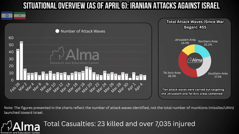 In recent days, there has been a significant Iranian focus on fire directed toward northern Israel. Over the past week (March 30–April 5), 18 waves of attacks were carried out toward the north, indicating an expansion of the geographic effort and increased pressure on this region.