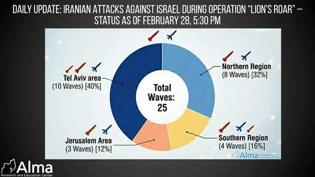So far, 23 waves of attacks have been carried out against Israel (28.2, 17:00): eight toward the northern region, nine toward the Tel Aviv area, three toward the Jerusalem area, and three toward the southern region.