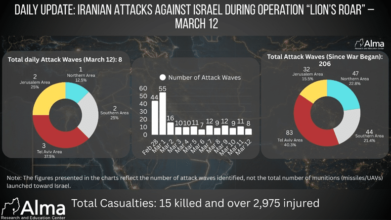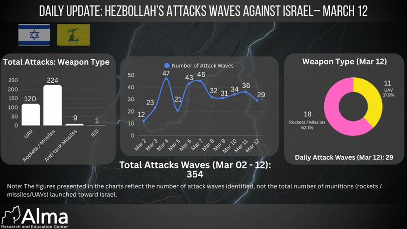 On March 12, 29 Hezbollah waves of attacks against Israel were identified. In terms of the types of weapons used, 18 waves of attacks (62.1%) were carried out using rockets and missiles, while 11 waves of attacks (37.9%) were carried out using UAVs.