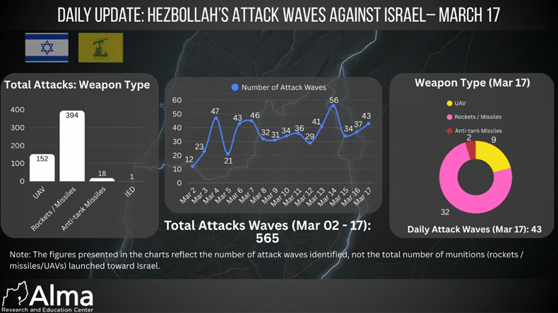 On March 17, 43 Hezbollah attack waves against Israel were identified. In terms of types of weaponry, 32 attack waves (approximately 74.4%) were carried out using rockets and missiles, 9 attack waves (approximately 20.9%) using UAVs, and 2 attack waves (approximately 4.7%) using anti-tank missiles.