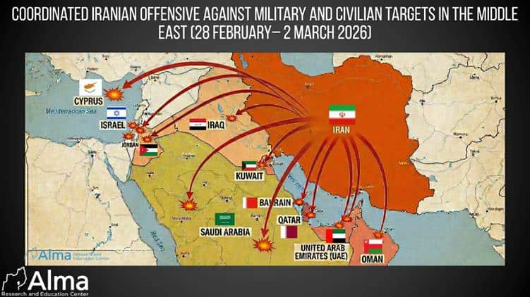 Iranian strikes across the Middle East are continuing. In the first attack on Cyprus, the Akrotiri base—a British Air Force base—was targeted by a UAV, causing property damage but no casualties. Cyprus is a member state of the European Union; therefore, this constitutes an attack against EU member states.