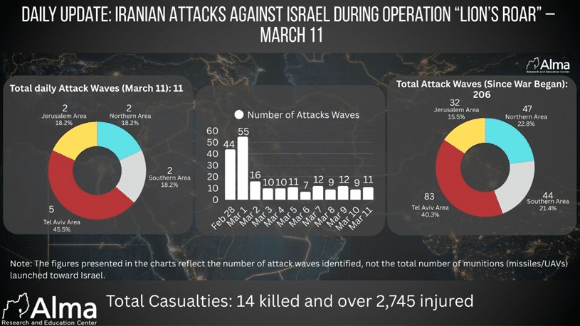 On March 11, 11 Iranian waves of attacks against Israel using ballistic missiles were identified. Geographically, most of the attacks were directed toward the Tel Aviv area, which absorbed 5 waves of attacks (45.5%). In addition, 2 waves of attacks were recorded in the north (18.2%), 2 waves in the south (18.2%), and 2 waves in the Jerusalem area (18.2%).