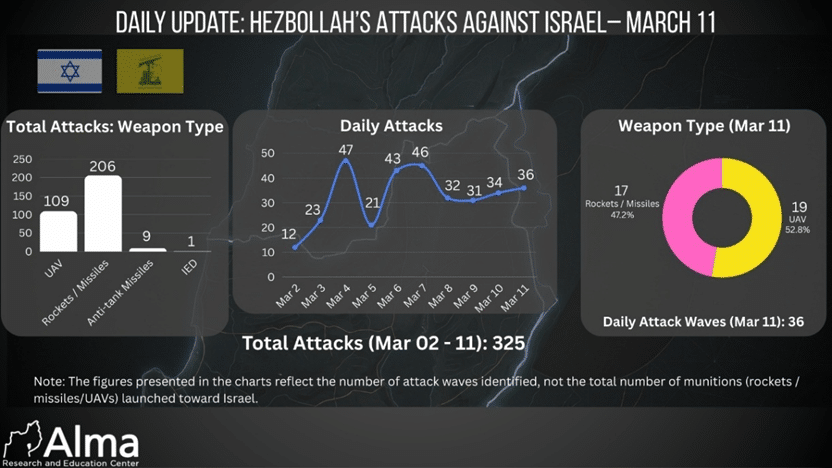 Since Hezbollah joined the fighting on March 2, a total of 325 waves of attacks against Israel have been identified. The data refer to the number of attack waves and not to the total number of munitions actually launched.