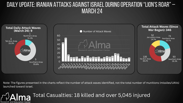 On March 24, nine waves of Iranian attacks against Israel were identified, carried out using ballistic missiles. This reflects a moderate increase compared to the previous day, while maintaining a consistent pattern of activity within Iran’s strategy of sustained pressure.