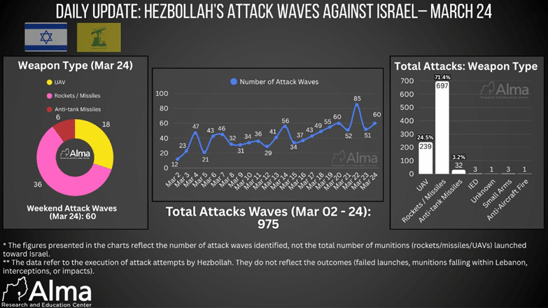 On March 24, 60 Hezbollah attack waves against Israel were identified, indicating continued intense and sustained activity, while maintaining high levels of attacks in recent days. In one of the rocket barrages fired by Hezbollah toward communities in the Galilee, a civilian woman was killed.