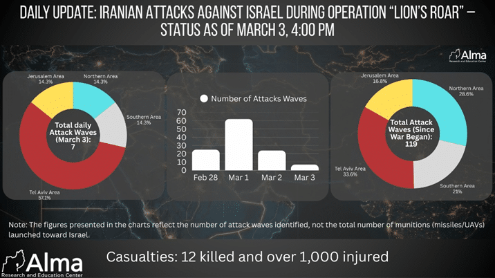 On the first day of the war (February 28), there were 25 Iranian attack waves against Israel; on the second day (March 1), which has so far been the most intense, there were 62 attack waves; on the third day, there were 24 attack waves from Iran. Since the beginning of the war, a total of 119 attack waves have been carried out from Iran against Israel.