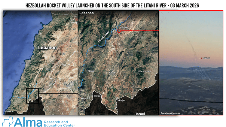 Lebanese President Joseph Aoun claimed that Hezbollah’s launches against Israel were carried out from north of the Litani. However, local documentation and geographic analysis of the launch points indicate that some of the launches were carried out, among other locations, from the village of Berghoz, which is located south of the Litani.