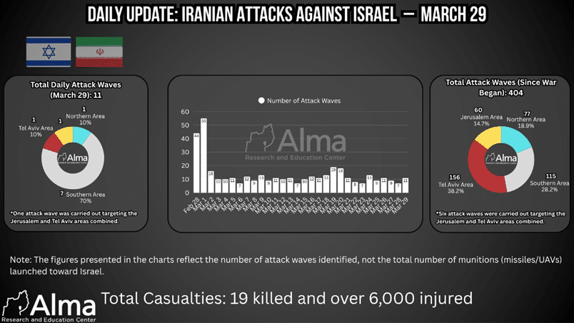On March 29, 11 Iranian attack waves against Israel were identified, carried out using ballistic missiles. This figure reflects a continued steady pace of attacks.