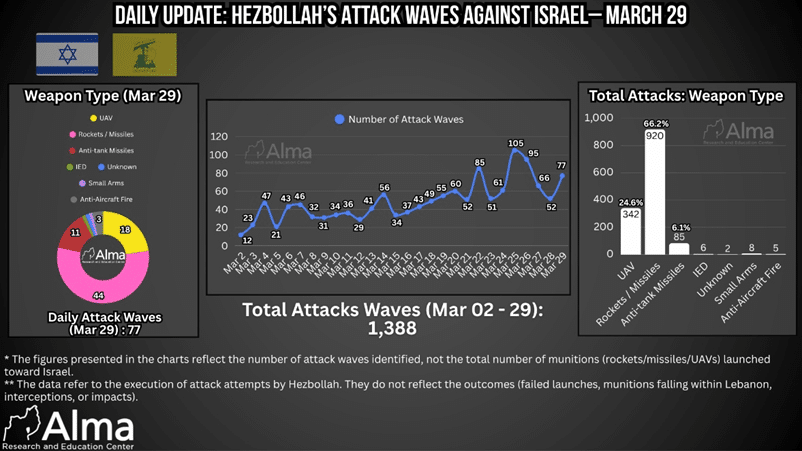 On March 29, 77 Hezbollah attack waves against Israel were identified, indicating continued high-intensity activity.