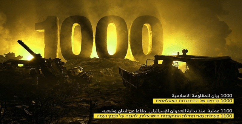 In the public sphere Hezbollah published a visual featuring the number “1000,” intended to highlight a cumulative achievement and emphasize the scope of the organization’s activity during the fighting. The number refers to one thousand official statements issued by the organization regarding attacks, alongside a reference to more than 1,100 operations carried out since the beginning of the war.