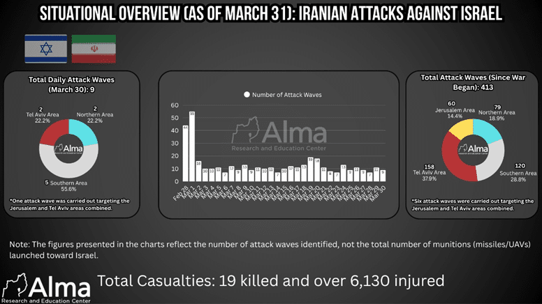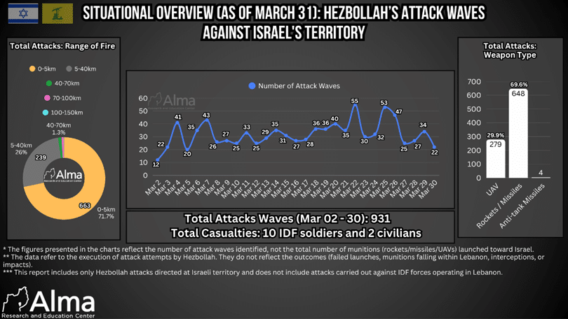 Hezbollah published a summary of its activity for March 30, stating that the organization claimed responsibility for 40 military operations. These included rocket fire, mortar fire, and unmanned aerial vehicle attacks against concentrations of forces, positions, and Israeli bases along the border and in northern Israel, as well as strikes against military targets in the Haifa area and the Tel Aviv area. In addition, clashes were reported in several sectors in southern Lebanon, along with hits on armored vehicles.