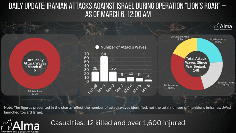 Since yesterday (as of 12:00, March 6), five Iranian attack waves have been launched toward Israel, including ballistic missiles, missiles with multiple warheads, and UAVs. All of the attacks were directed toward the Tel Aviv area, where a population concentration of approximately four million Israelis resides.