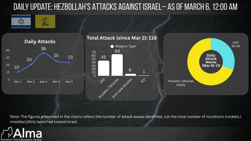 Since the beginning of its involvement, Hezbollah has carried out a total of 116 attack waves against Israeli territory and IDF forces operating in Lebanon, including rocket launches, missiles, UAVs, anti-tank missiles, and an explosive device attack (based on Hezbollah’s claims of responsibility).