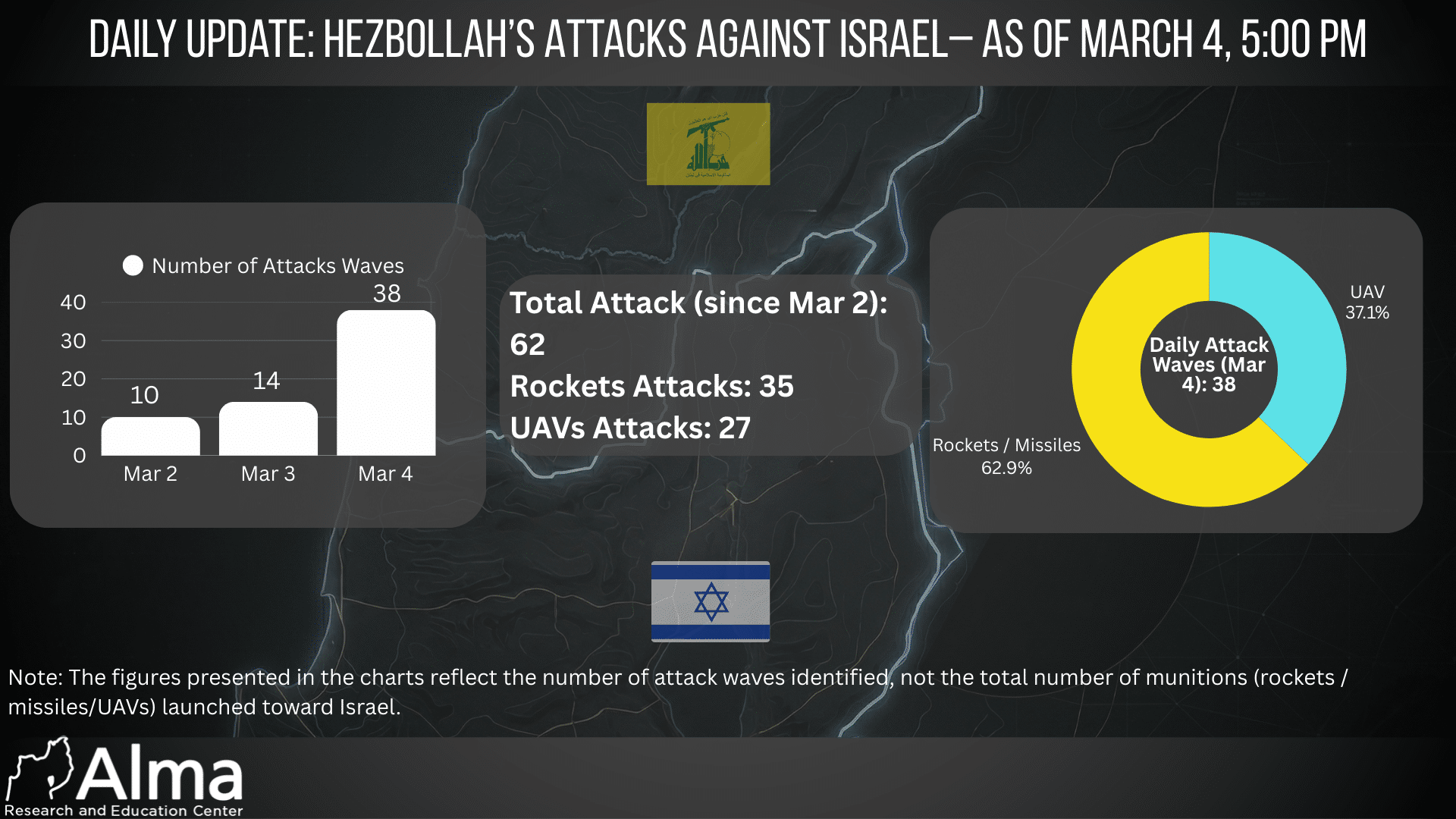 Daily Update: Hezbollah Joins the War and the Opening of a Northern Front – Situation Overview as of March 4, 17:00 On March 2, Hezbollah officially joined the war and launched a wave of attacks toward northern Israel. Since the beginning of its involvement, it has carried out a total of 62 attack incidents against Israeli territory, including launches of rockets, missiles, and UAVs. Over the past 24 hours, Hezbollah carried out 38 attacks against Israel using UAVs, anti-tank missiles, rockets, and missiles. Hezbollah has expanded the range of its fire, and over the past day carried out three missile launch attacks toward the Tel Aviv area, in addition to attacks directed at communities along the confrontation line, the Galilee, and Haifa. So far, Hezbollah’s primary weapon has been UAVs. However, over the past day there has been a noticeable increase in the use of missile and rocket fire, which now constitutes the main weapon employed by Hezbollah. In addition, several simultaneous attacks were carried out from Lebanon by Hezbollah and from Iran (according to several reports, there may be attempts to coordinate the attacks between Iran and Hezbollah). On the first day that Hezbollah joined the war (March 2), 12 attack waves were recorded. On the second day, 15 attack waves were recorded. On the third day, a significant increase was observed and documented – 38 attack waves (as of 17:00). Damage to the civilian front in Israel: • While Hezbollah claims it is targeting military objectives, over the past 24 hours a hit on a residential home in a Galilee community was reported, causing extensive damage. • The current threat spans a broad civilian area from the Lebanese border to Tel Aviv, including the Galilee, Haifa Bay and the Krayot, the Jezreel Valley, and the Tel Aviv metropolitan area. Millions of Israeli civilians live in these areas.