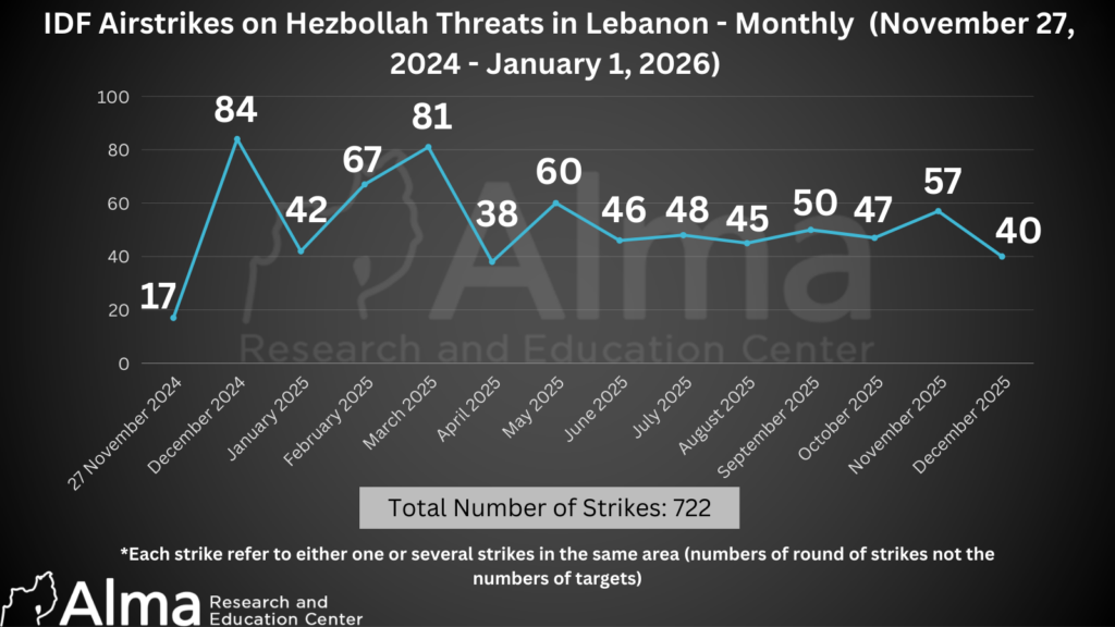 IDF airstrikes against Hezbollah threats in Lebanon – by month (27 November 2024 – 1 January 2026): the graph presents the monthly number of IDF airstrikes carried out against Hezbollah targets in Lebanon since the ceasefire came into effect. In total, 722 rounds of strikes were conducted.