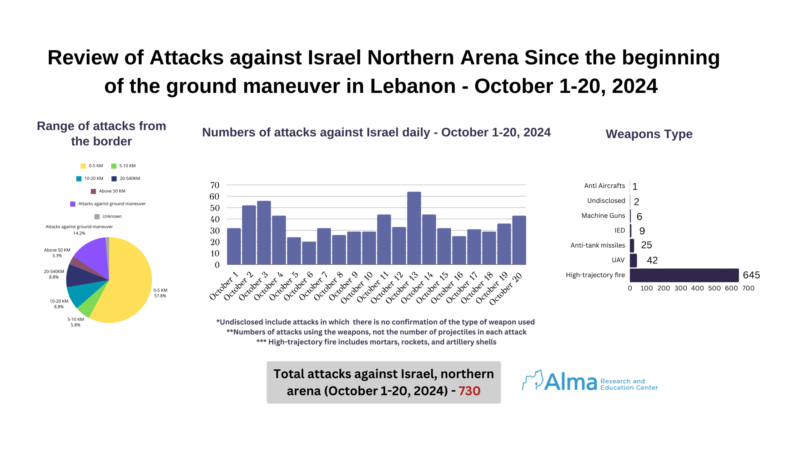 Hezbollah carries out most of its attacks (57.8%) in areas and towns near the border with Lebanon (0–5 km). Hezbollah carried out 14.2% of its attacks against IDF forces maneuvering in Lebanon, with the majority (77) employing high-trajectory fire and the remainder using anti-tank missiles (13), IEDs (9), and Machine Guns (7).