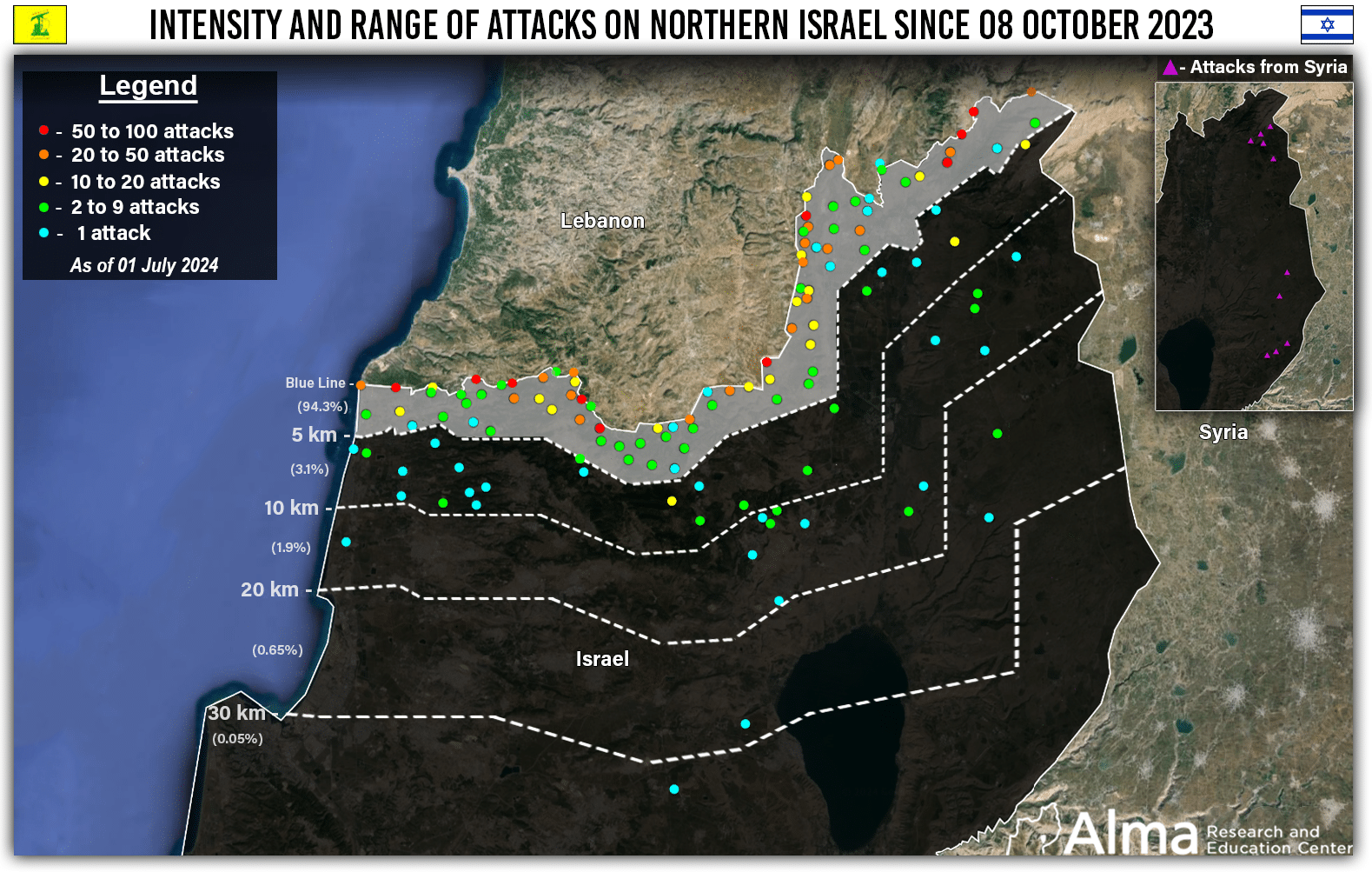 94.3% of the attacks against Israel were carried out within 0-5 km from the border.