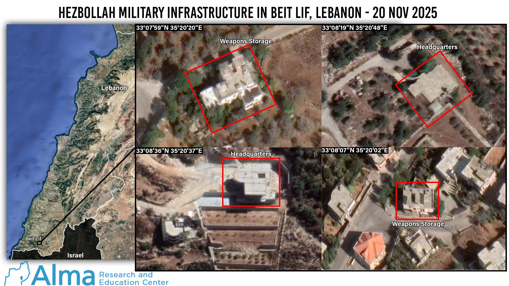 Hezbollah continues to build up its forces south of the Litani River in clear violation of the understanding between Lebanon and Israel established almost a year ago. These four buildings used by Hezbollah are just a few out of dozens of others in the village of Beit Lif where threats to Israel are being constructed. In the image on the bottom right, notice how Hezbollah specifically chose this building to store weapons for its close proximity to surrounding civilian structures in every direction. This is a prime example of Hezbollah’s human shield tactic.