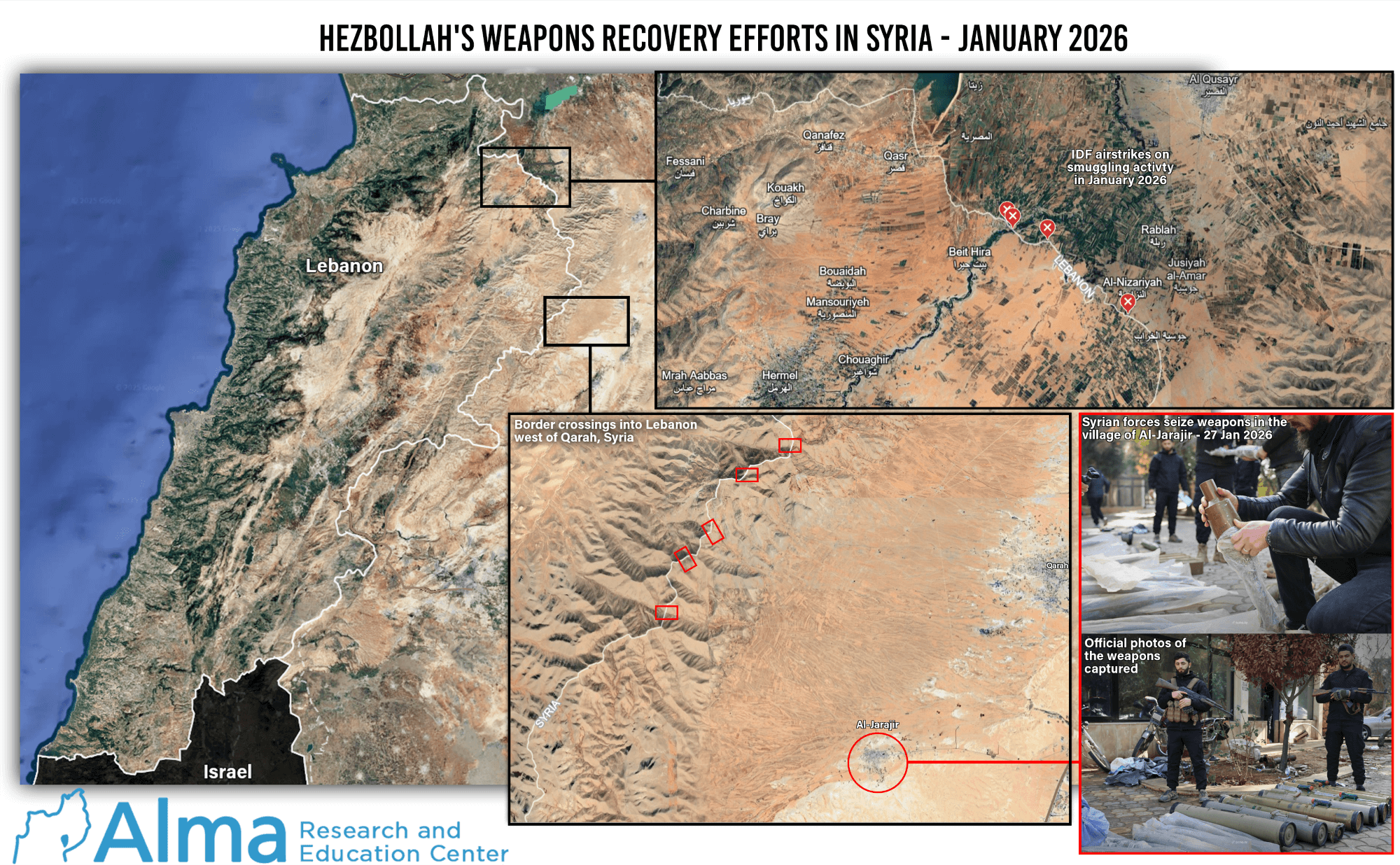 In this context, activity by Syrian security forces to thwart the smuggling of weapons from Syria into Lebanon has also been observed. On 26 January, Syrian security forces announced the foiling of a shipment of combat means in the Al-Jarajir area, which included 9M113 Konkurs anti-tank missiles, RPG-7 rounds, Fajr rockets, Tandem HEAT rockets, and other light weapons.