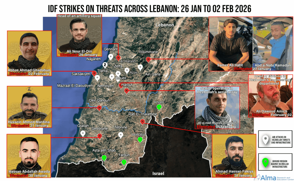 During the week between January 26 and February 2, the IDF carried out 26 airstrikes across Lebanon, in areas both north and south of the Litani River. Sixteen of the strikes were conducted north of the Litani, and an additional nine were carried out in the area south of the Litani. As part of the strikes, 11 Hezbollah operatives were eliminated, including the head of an artillery team in the village of al-Harash, who also operated within Hezbollah’s media network, al-Manar; a department head in the Engineering Unit; and a senior figure in the organization’s air defense array. In addition, military infrastructure and engineering equipment used under civilian cover for the purpose of rehabilitating Hezbollah’s military activity were targeted. Among the targets were weapons depots located inside civilian buildings, for which evacuation warnings to the civilian population were issued prior to the strikes. Most of the infrastructure strikes were carried out in the area north of the Litani River. In parallel with the aerial activity, the IDF conducted five ground operations along the line of contact, as part of the effort to prevent renewed entrenchment and the reconstruction of Hezbollah’s military infrastructure in this area.