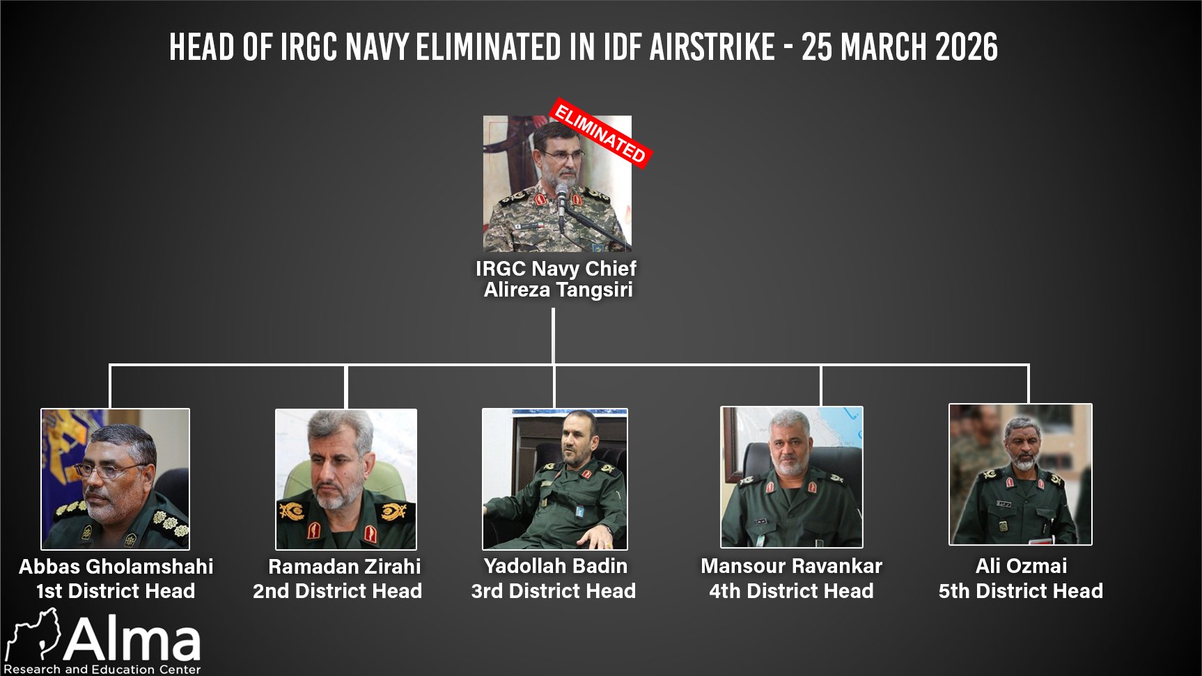 During the night, the Commander of the Islamic Revolutionary Guard Corps Navy (IRGC Navy), Ali Reza Tangsiri, was eliminated. He had been serving in this position since August 2018. Tangsiri, who was born in 1962 in Bushehr Province in western Iran, served as Commander of the Northern Persian Gulf Maritime Areas and the Strait of Hormuz region until 2009. He was then appointed Deputy Commander of the IRGC Navy until his promotion to Commander. Tangsiri was responsible for enforcing the Iranian blockade on the Strait of Hormuz and oversaw the IRGC Navy’s maritime terrorism activities in the region. International sanctions were imposed on him for his involvement in arms smuggling with Russia and Syria during the Assad regime. Along with Tangsiri, the head of the Intelligence Department of the IRGC Navy, Behnam Rezaei, was also eliminated. Under Tangsiri’s command serve five regional commanders responsible for the operational areas under the IRGC Navy. The area directly responsible for the Strait of Hormuz is Operational Area No. 1 – the “Bandar Abbas Area,” the largest of the five areas. Its commander since 2016 has been General Abbas Gholamshahi. A special and comprehensive report on the Islamic Revolutionary Guard Corps Navy, which we published in April 2024, can be read at the following link: https://israel-alma.org/islamic-revolutionary-guard-corps-navy-irgcn/