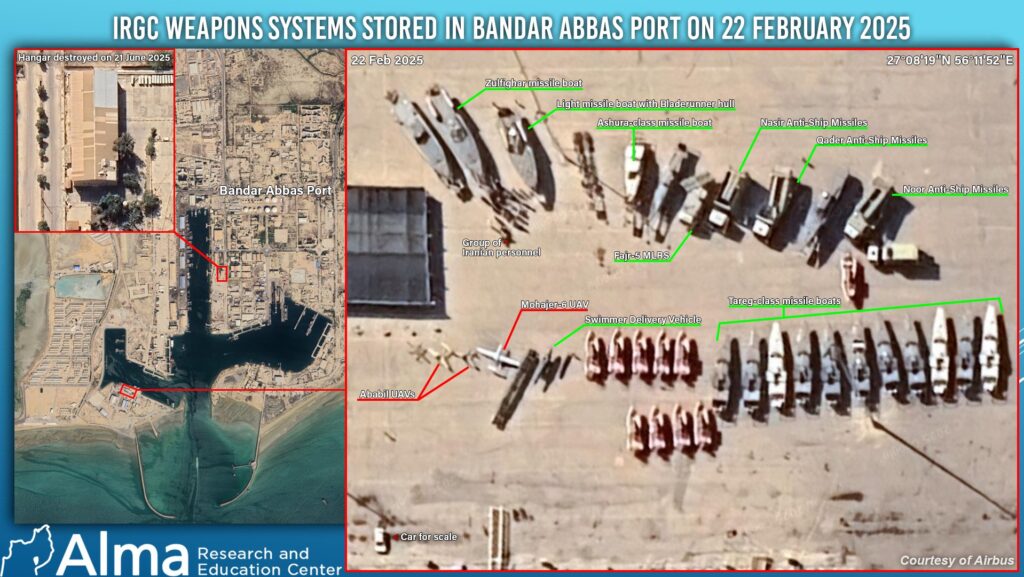 In this February 2025 satellite image (Airbus), a variety of lethal IRGC assets were on display within the Bandar Abbas port: Anti-Ship missiles, Fast Attack Boats, and Unmanned Aerial Vehicles. On June 21, 2025, the IDF destroyed the UAV storage warehouse at Bandar Abbas port. Based on this image, we can identify the types of UAVs destroyed: Ababil UAVs, Mohajer-6, and some smaller ISR aircraft. All forward-deployed to be used in the event of confrontation over the Strait of Hormuz, the vital waterway through which roughly 30% of global seaborne oil traffic passes. We will soon be publishing a special update on the Iranian forces positioned around the Strait of Hormuz and how Iran could leverage concessions by force.