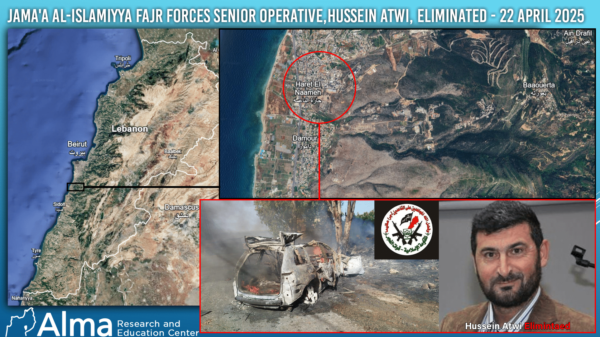 Sheikh Hussein Atwi, a very senior figure in Al-Jamaa Al-Islamiya – Al-Fajr Forces, was killed on the morning of April 22 in an airstrike while driving his car on Awarta road in the Haret Al-Naameh area, south of Beirut. Al-Fajr Forces operates in Lebanon as an organic framework within Hamas-Lebanon-Military, and therefore, Atwi is also considered a senior figure in the Hamas-Lebanon military branch. According to an estimate, Al-Fajr Forces currently numbers about 1,000 operatives within the Hamas-Lebanon military branch. Al-Fajr Forces were part of seven different organizations that operated in coordination with Hezbollah in the war against Israel in southern Lebanon. Their first terrorist activity during the war was launching rockets into Israeli territory on October 18, 2023. From October 2023 until the ceasefire in November 2024, 14 Al-Jamaa Al-Islamiya / Al-Fajr Forces operatives (some of them senior) were killed. Atwi is the 15th eliminated.