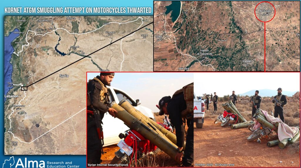 Attempts to smuggle weapons from Syria into Lebanon for Hezbollah continue. The geographic area around the town of al-Qusayr remains a central hub for smuggling routes. Approximately 20 Kornet anti-tank missiles were seized by Syrian security forces on October 11. The smuggling attempt was carried out using two motorcycles onto which the missiles were loaded. Smuggling by motorcycle can be faster and better suited to rough, hard-to-traverse terrain. The illegal land border crossings between Syria and Lebanon are improvised and can even be opened ad hoc for smuggling purposes. Although a motorcycle is very limited in its carrying capacity, as can be seen in the photos, it all comes down to determination and motivation in carrying out the smuggling.