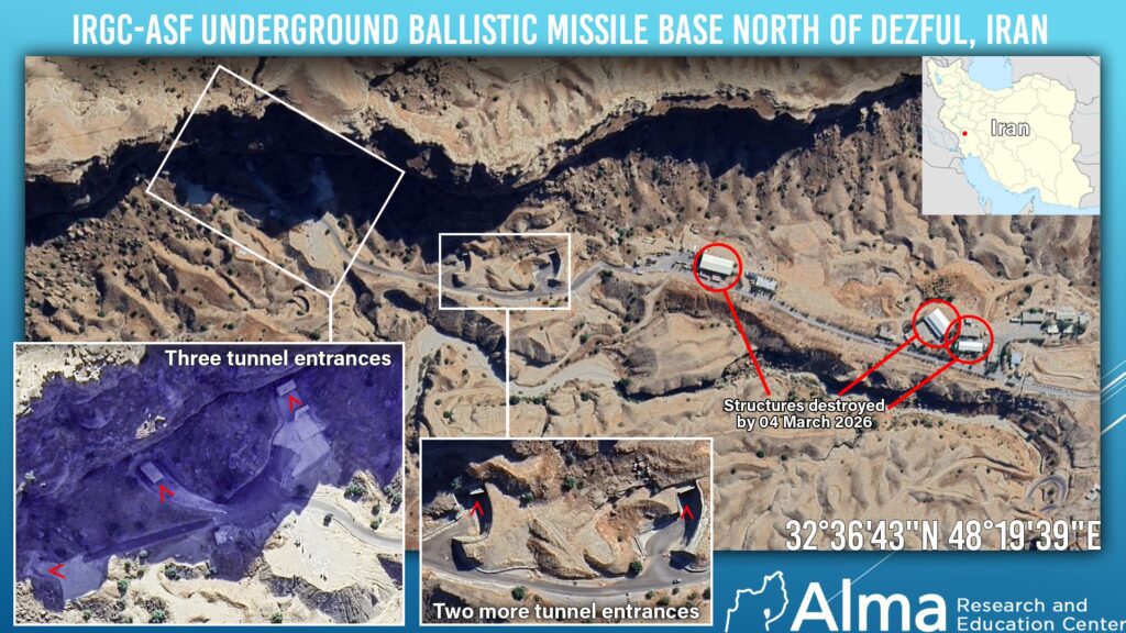 Dezful North – In Khuzestan province, this base sustained damage on the surface during operations in June 2025. The main exterior support site, which survived the June 2025 operation, has now been completely destroyed at some time between 01 and 03 March 2026.