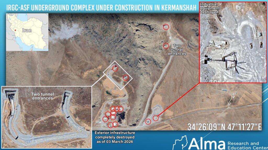 Kermanshah North – In Kermanshah province, the tunnel entrances and structures outside them were hit with airstrikes during operations in June 2025. Since the start of operations on 28 February 2026, the entire exterior support site has been destroyed, and the entrances were once again targeted. Industrial construction equipment outside the base has also been destroyed.