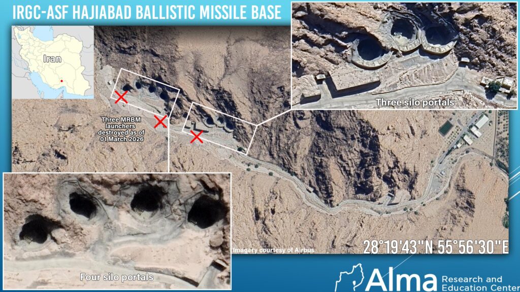 Hajiabad – In Hormozgan province, this MRBM base was not targeted during operations in June 2025. At least three mobile MRBM launchers have been destroyed above ground at the base as of 01 March 2026. This base has silos for underground launch capability.