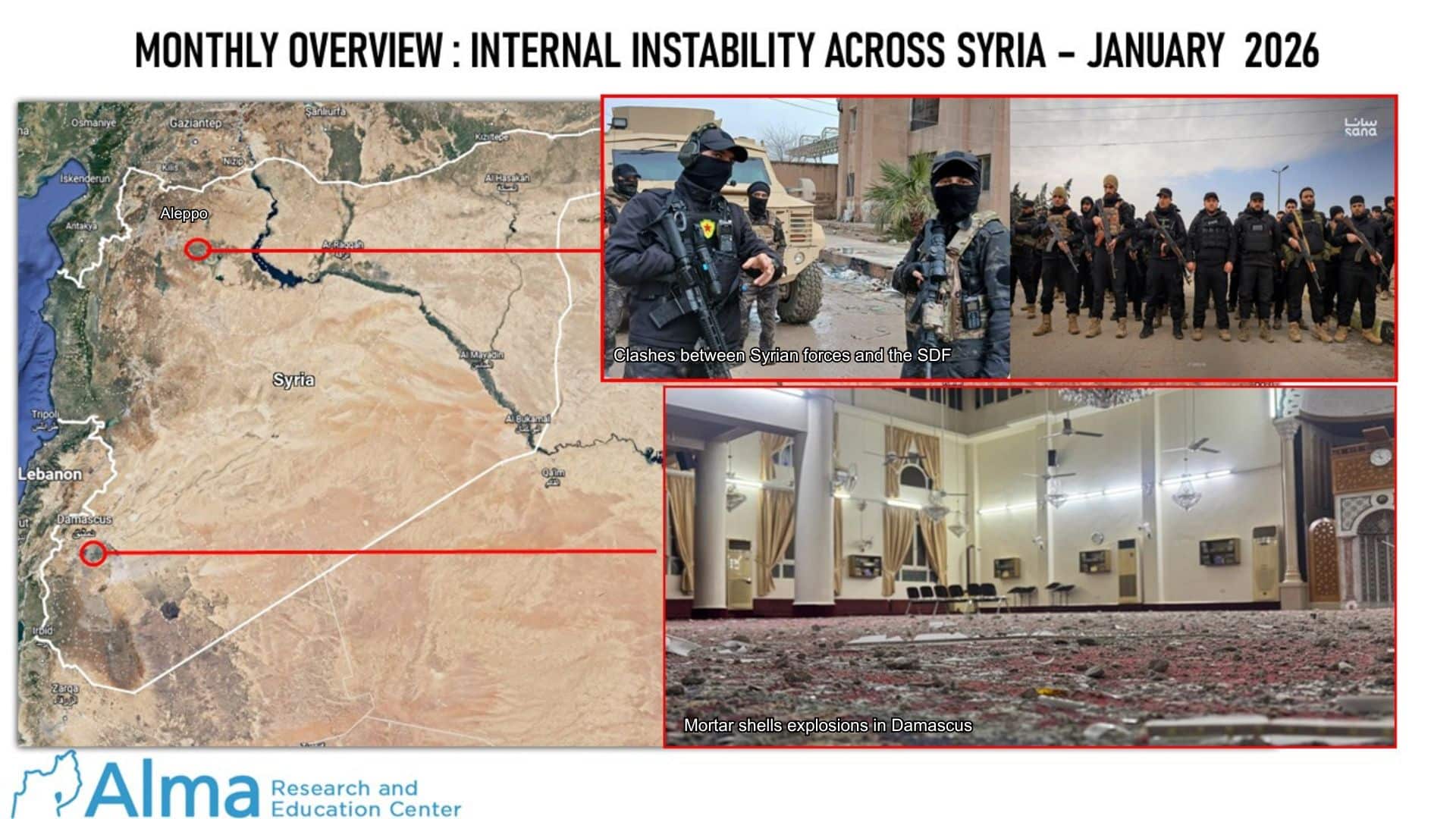 After weeks of fighting between the Syrian regime’s security forces and the Kurdish Syrian Democratic Forces (SDF), a ceasefire was declared between the sides on January 30, 2026. In our assessment, the regime’s forces received Turkish backing and assistance in the form of weapons, intelligence, the deployment of various operational capabilities, and logistics. The fighting began with localized clashes in the Aleppo area in early January 2026, following many months of tension, military friction, and failure to implement the agreement signed on March 10, 2025.