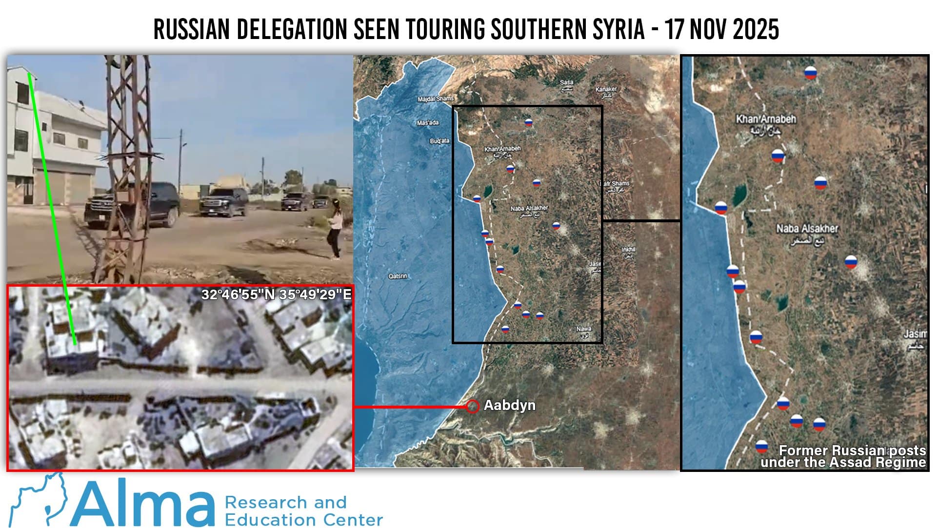 On 17 November 2025, an official Syrian government convoy was filmed traveling north from the village of Aabdyn towards Jamlah and reportedly had Russian officials accompanying them. Under the Assad regime, southern Syria had a large deployment of Russian “military police” forces who were forced to withdraw following the takeover of Ahmed Al Sharaa’s forces in Damascus. The presence of a Russian delegation touring their former area of operations is a clear signal of intent to engage with the new Syrian government and possibly return to the Syrian side of the border with Israel. Additionally, according to several unverified reports, Turkish officials were also present in the convoy. We do not know whether this is accurate or not. If true, this would mark the first known instance of a Turkish presence on Syrian soil in very close proximity to the Israeli border.