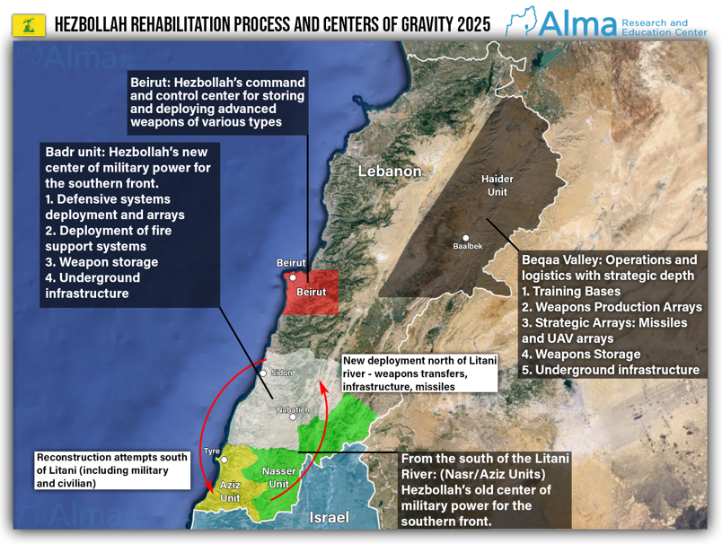 Hezbollah is accelerating its rehabilitation particularly in the area north of the Litani, in its new geographic center of gravity — the Badr Unit sector — which has become the focal point of Hezbollah’s deployment in the southern front in terms of fire activation, defence, and weapons storage. Before the war, the center of gravity was south of the Litani in the Naser and Aziz units’ sectors. As a result of the war, and due to severe damage to those units, the center of gravity shifted north of the Litani — to the Badr Unit sector.