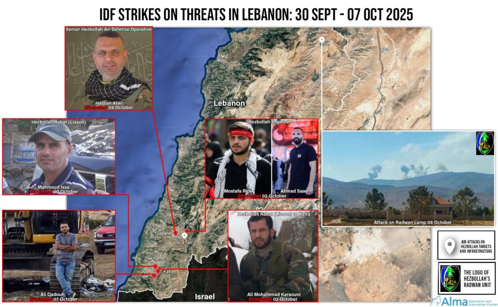 During September and October 2025, four Hezbollah “rabat” (regional liaison official) were eliminated. The eliminated were, Abd al-Munem Musa Sweidan, Rabat of the village of Yatir, Ali Muhammad Qurani and Mahmoud Ali Issa, Rabat’s of Kafra and the Rabat of Marhab al-Biad’a area Abd Mahmoud Al-Sai’d.
