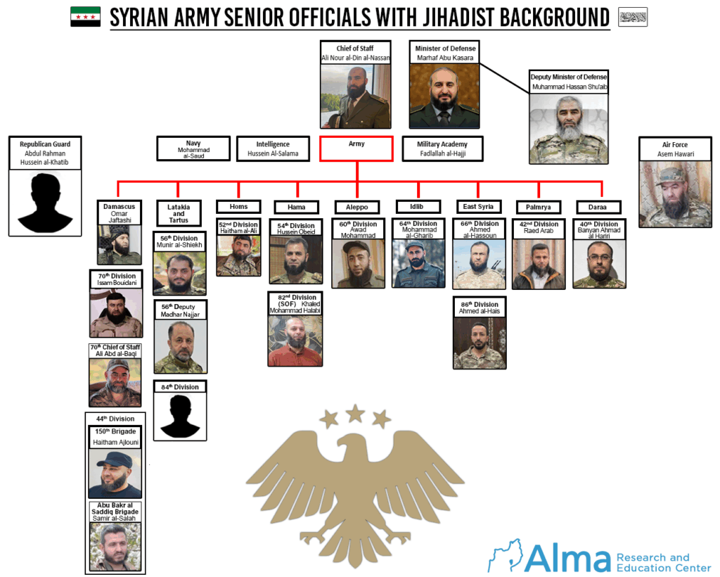 Finally, it is important to note that this is only a partial list. Firstly, due to significant information gaps regarding military officials and personnel, and secondly, because, as we noted in the report, entire organizations have undergone “rebranding” under the military while, in practice, retaining the same ideology. In other words, it is highly likely that the number of commanders and soldiers in the new Syrian army with a jihadist background or ideology is considerably higher.