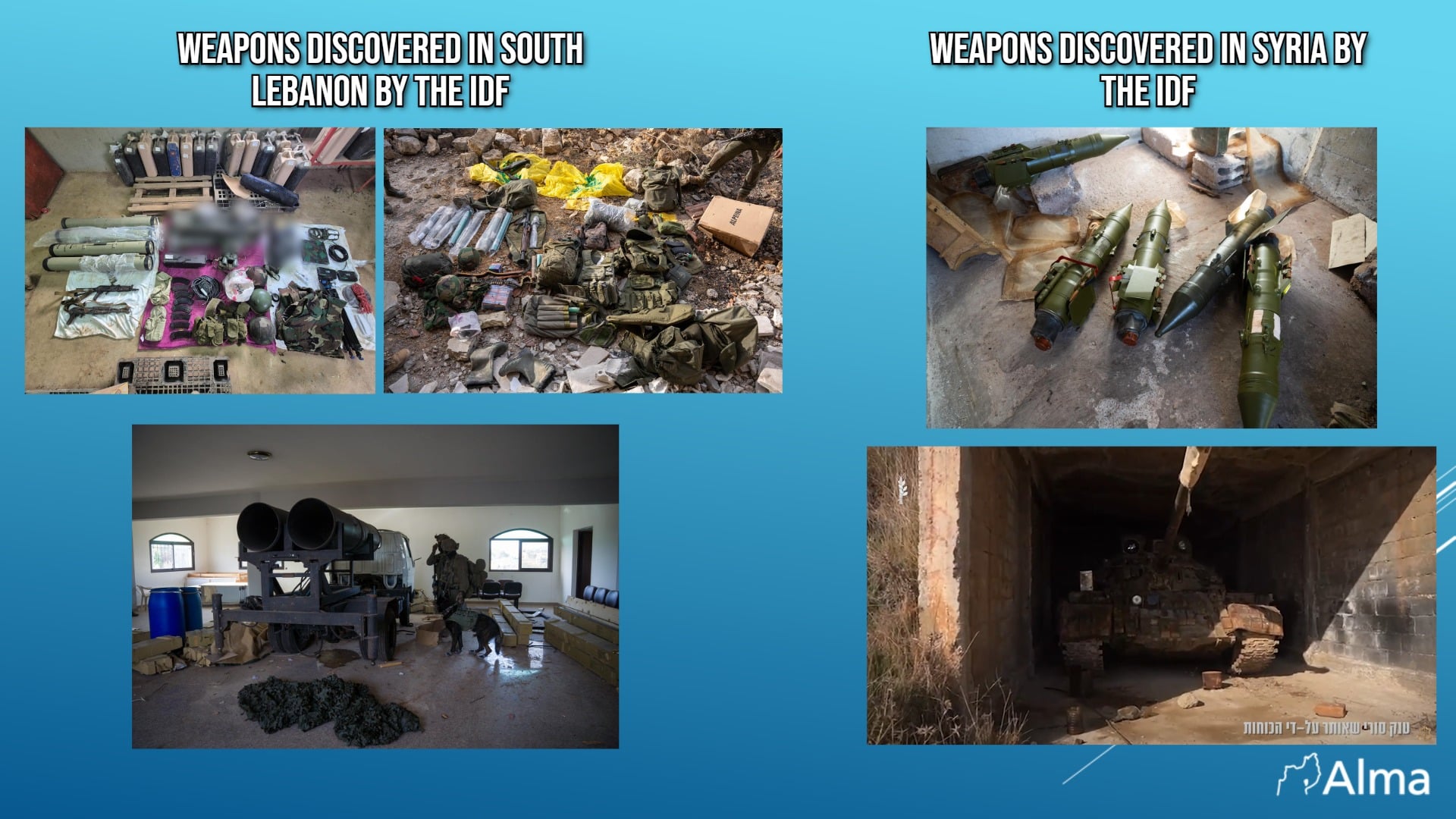 Weapons found by IDF forces (right) and a Syrian tank (left)