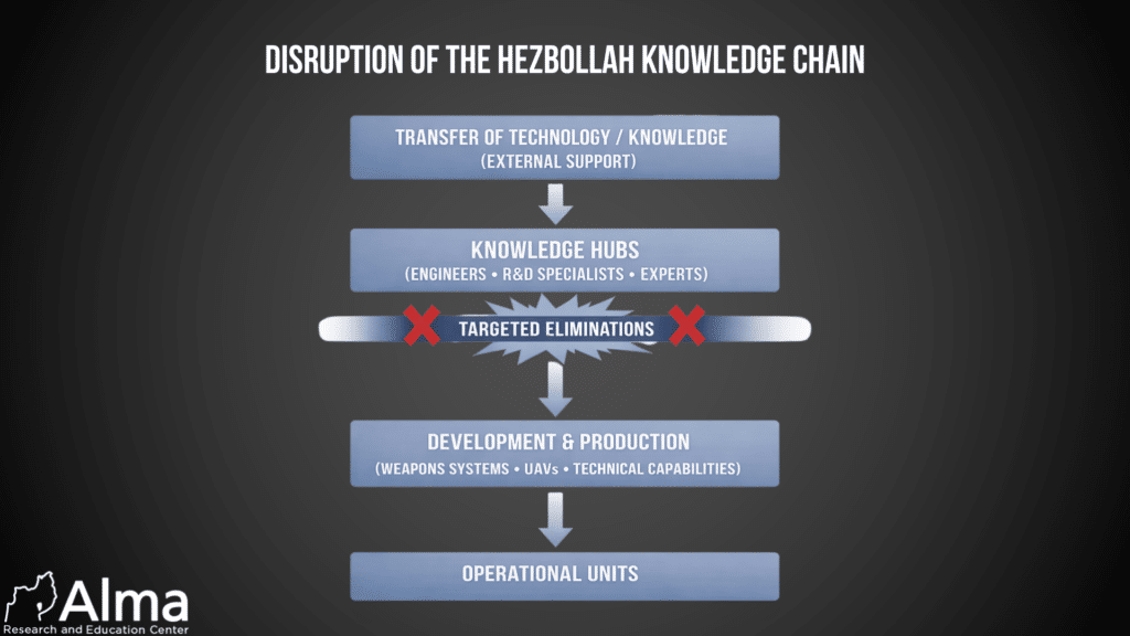 One of the most effective tools for disrupting Hezbollah’s production and force-building system is targeting “knowledge hubs” within Hezbollah, and not only commanders or infrastructure. This concept is based on the understanding that technological, engineering, and scientific knowledge in Hezbollah is often concentrated in a relatively small number of experts. Therefore, harming them may create a broader impact than destroying material or operational infrastructure alone.