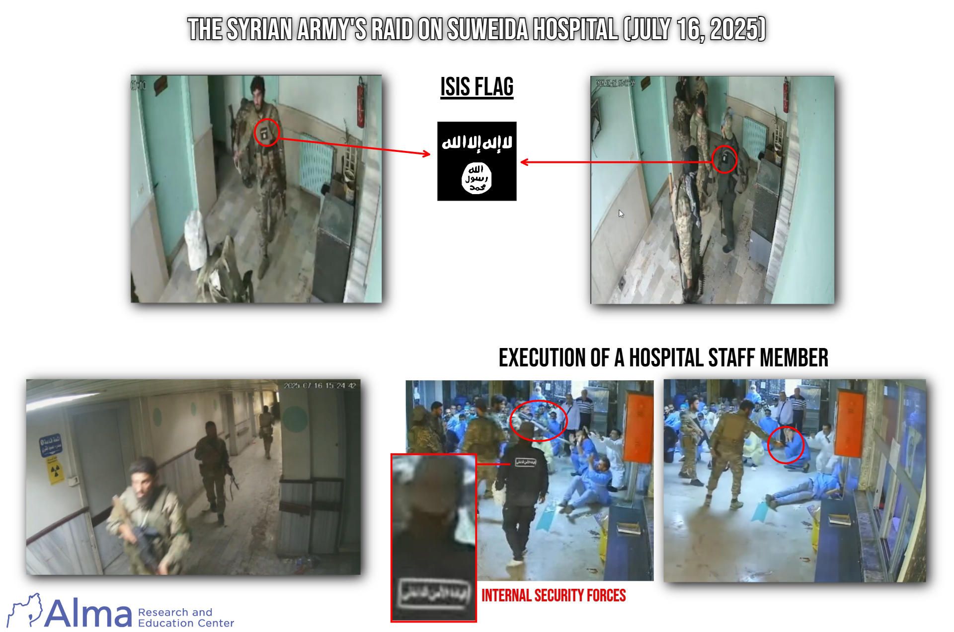 On July 16, during the fighting in Suwayda, soldiers from the Syrian Army and members of the Syrian Internal Security Forces carried out a raid on the hospital in Suwayda. From security camera footage published on August 10 (see images), it can be seen that during the raid the soldiers detained the hospital staff and executed at least one member of the hospital staff. In addition, some of the soldiers were identified with ISIS symbols on their uniforms. During the fighting in Suwayda, at least 1,000 soldiers from the New Syrian Army took part. The military force was composed of soldiers who were sent from and arrived from at least nine different divisions, some of which were composed of militias with a jihadist orientation. It is possible that the soldiers identified with ISIS symbols in the hospital came from the 82nd Division of the New Syrian Army, whose soldiers were seen in the combat area with ISIS flags and symbols. This division operates originally in the Hama area and the Syrian coast, in the area of the former 25th Division of Assad’s army. The commander of the division is Khaled Muhammad Halabi (Abu Khattab – photo attached), a former officer in Assad’s army who defected after the outbreak of the civil war. Over the years, Halabi advanced in the service of the rebels until he became the commander of the Ansar al-Tawhid organization (formerly known as Jund al-Aqsa). This organization holds an extreme jihadist-Salafist ideology and apparently even cooperated with ISIS at certain times. Halabi is considered one of the prominent figures behind the planning and execution of the rebel attack that led to the fall of Assad’s regime.
