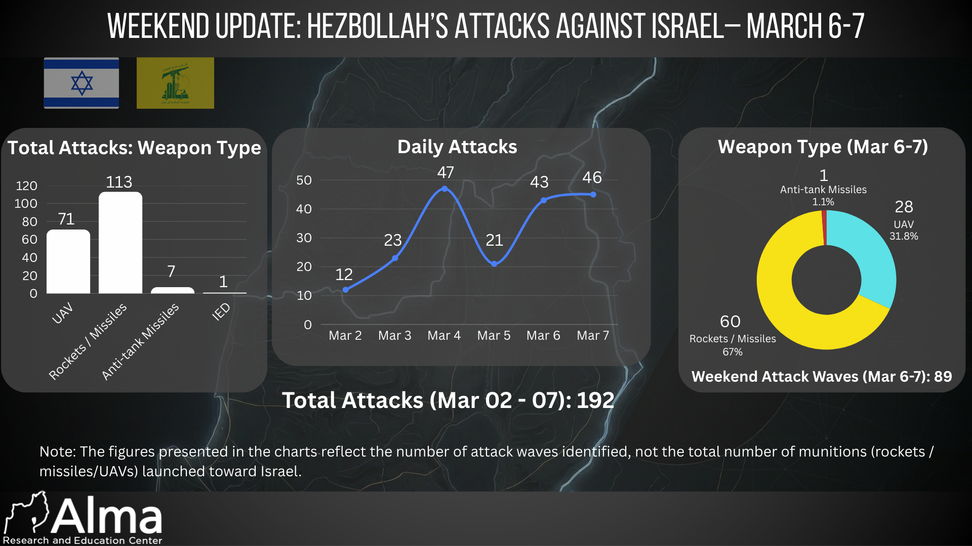 Starting with this update, the data will be calculated and presented according to full calendar days (00:00–23:59) rather than rolling 24-hour periods. Since Hezbollah joined the war (March 2), it has carried out a total of 192 attack waves against Israeli territory, including launches of rockets, missiles, and UAVs (this figure represents the number of attack waves, not the total number of munitions launched toward Israel). Over the weekend (March 6–7), Hezbollah conducted 89 attack waves against Israel using rockets, UAVs, and anti-tank missiles. The data indicate a significant increase in the scope of activity compared to the first days of the conflict. The main areas targeted by Hezbollah are frontline communities along the Israel–Lebanon border, communities in the Galilee, the Krayot area, and the city of Haifa. By maintaining heavy fire, Hezbollah appears to be attempting to create a “victory narrative” and pressure residents of Israel’s northern border communities to evacuate their homes, similar to the early stages of the war that began in October 2023. Hezbollah has also carried out attacks against IDF forces operating in southern Lebanon, and 8 Israeli soldiers were wounded over the weekend. In terms of attack patterns, rockets and missiles remain Hezbollah’s primary weapons, accounting for the majority of attacks over the weekend (about 67%). Approximately 31.8% of the attacks were carried out using UAVs, and in one instance, an anti-tank missile was used against IDF forces. This trend indicates continued extensive use of UAVs alongside large-scale rocket fire. Looking at the daily trend, the number of attacks has fluctuated: on the first day of Hezbollah’s involvement (Mar 2) 12 attack waves were recorded; on the second day (Mar 3) 23 attack waves; on the third day (Mar 4), the most intense day so far, 47 attack waves; on the fourth day (Mar 5) 21 attack waves; on the fifth day (Mar 6) 43 attack waves; and on the sixth day (Mar 7) 46 attack waves. Impact on the civilian area in Israel: During the weekend, minor damage was reported to private homes, public buildings, and infrastructure in northern Israel, mainly due to direct rocket impacts in populated and unpopulated areas. One Hezbollah rocket struck a chicken coop in a border community.